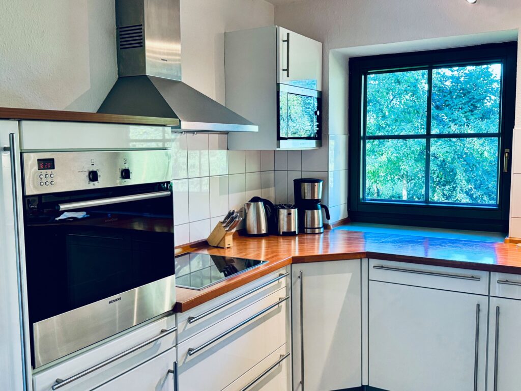 Im Erdgeschoss befindet sich der helle Wohnbereich mit gemütlicher Couchgarnitur, Flachbild-TV und einem Essplatz für die ganze Familie. Von hier aus gelangen Sie direkt auf die möblierte Terrasse, die zu entspannten Stunden im Freien einlädt. Die separate, geschlossene Küche ist vollständig ausgestattet und verfügt unter anderem über Ceranfeld, Backofen, Kühlschrank mit Gefrierfach, Toaster, Wasserkocher, Kaffeemaschine sowie reichlich Geschirr und Küchenutensilien – perfekt für gemeinsame Kochabende.