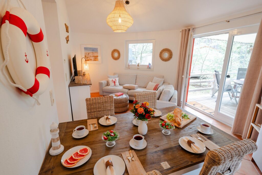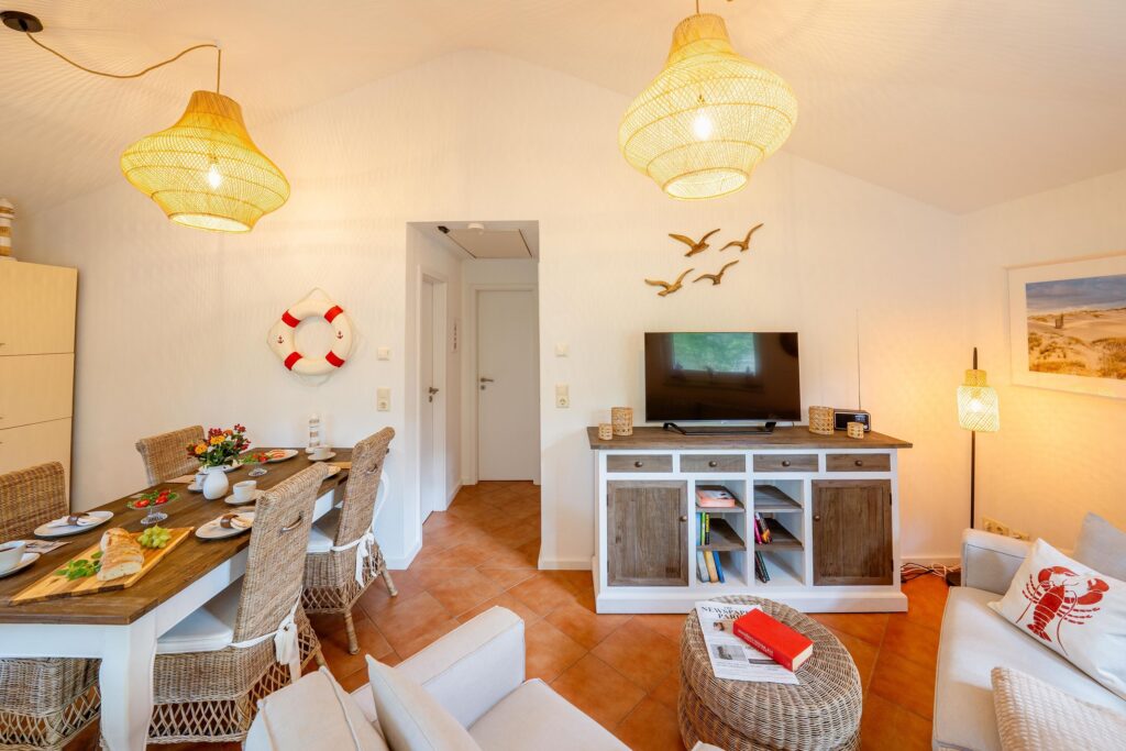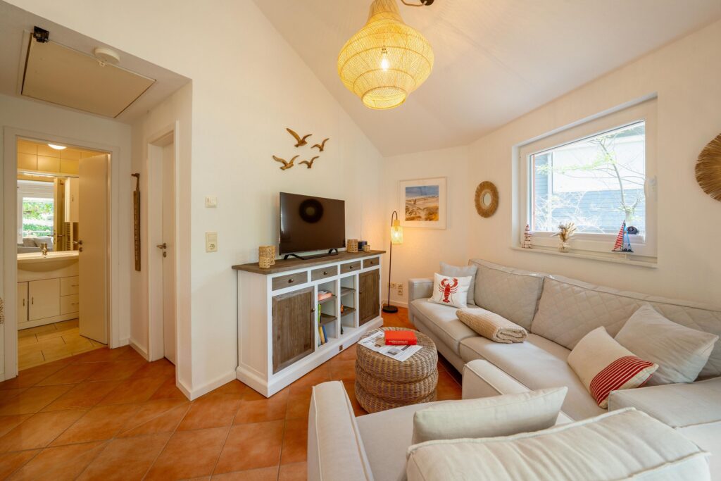 Der helle Wohnbereich mit offener Küche ist be...Weiterlesenstens ausgestattet und lässt keine Wünsche offen. Entspannen lässt es sich im Wohnbereich inkl. großen gemütlichen Sofa, Urlaubslektüre, Stehlampe, Smart-TV inkl. O2 TV mit 100HD Sendern und Internet-Radio mit Bluetooth.