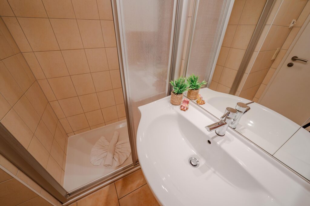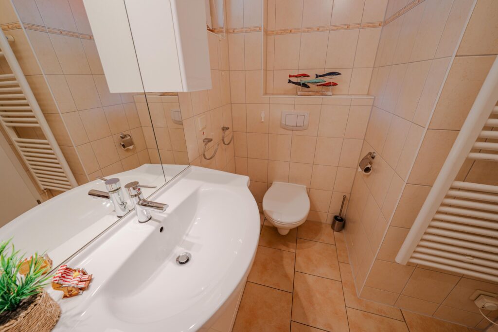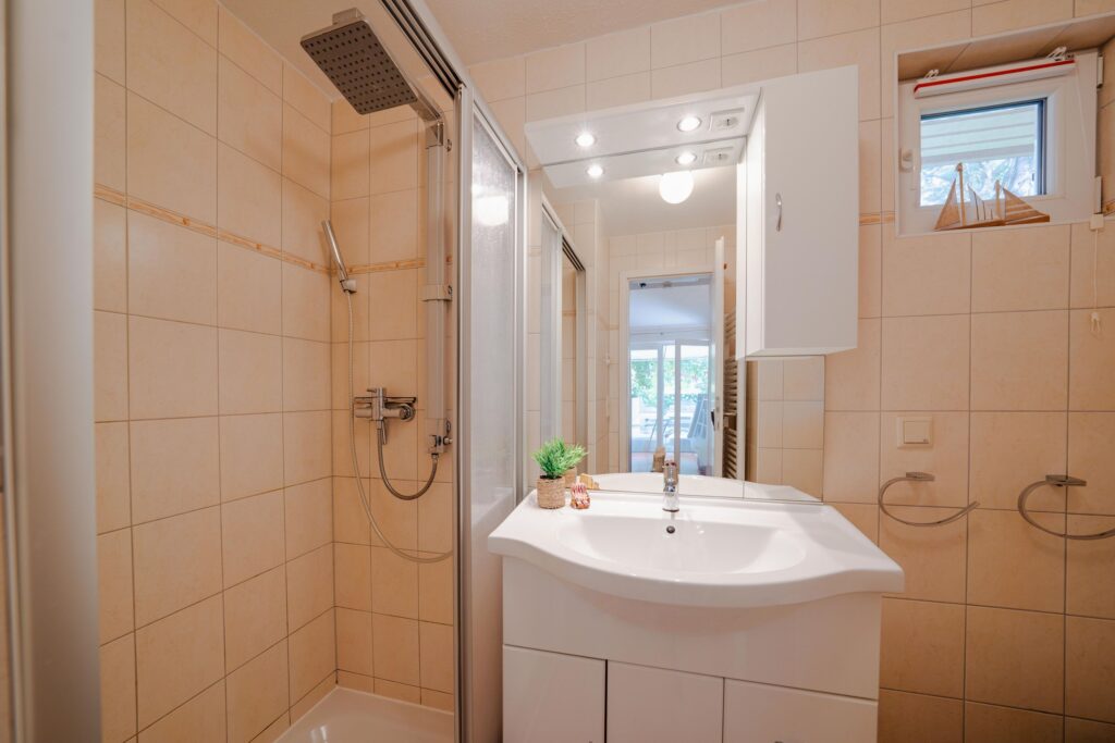 Das Badezimmer ist ein Tageslicht-Bad mit ebenerdiger Dusche, Waschplatz, Fön, Kosmetikspiegel, Insektenschutzgitter und WC