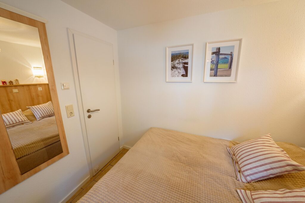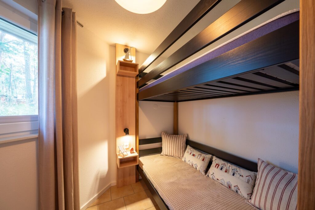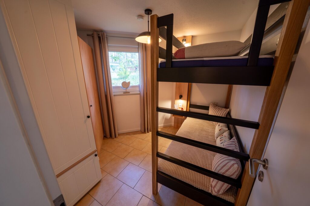 Erholsamen Schlaf finden Sie in zwei separaten Schlafzimmern, in einem mit Boxspring-Doppelbett (140 x 200 cm) und in dem anderen mit modernem Etagenbett (90x190cm) mit eingebauter Beleuchtung inkl. USB-Ladestecker.