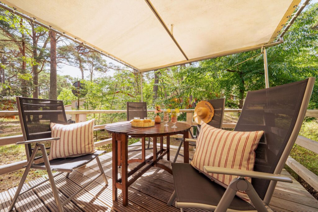 Auf der eigenen, überdachten Terrasse lässt es sich wunderbar entspannen. Ein Stellplatz für Ihren PKW steht für Sie direkt vor dem Ferienhaus Tipi 365 bereit. Die Internetverbindung über WLan kann selbstverständlich kostenfrei genutzt werden. Ein Hund ist hier herzlich willkommen.