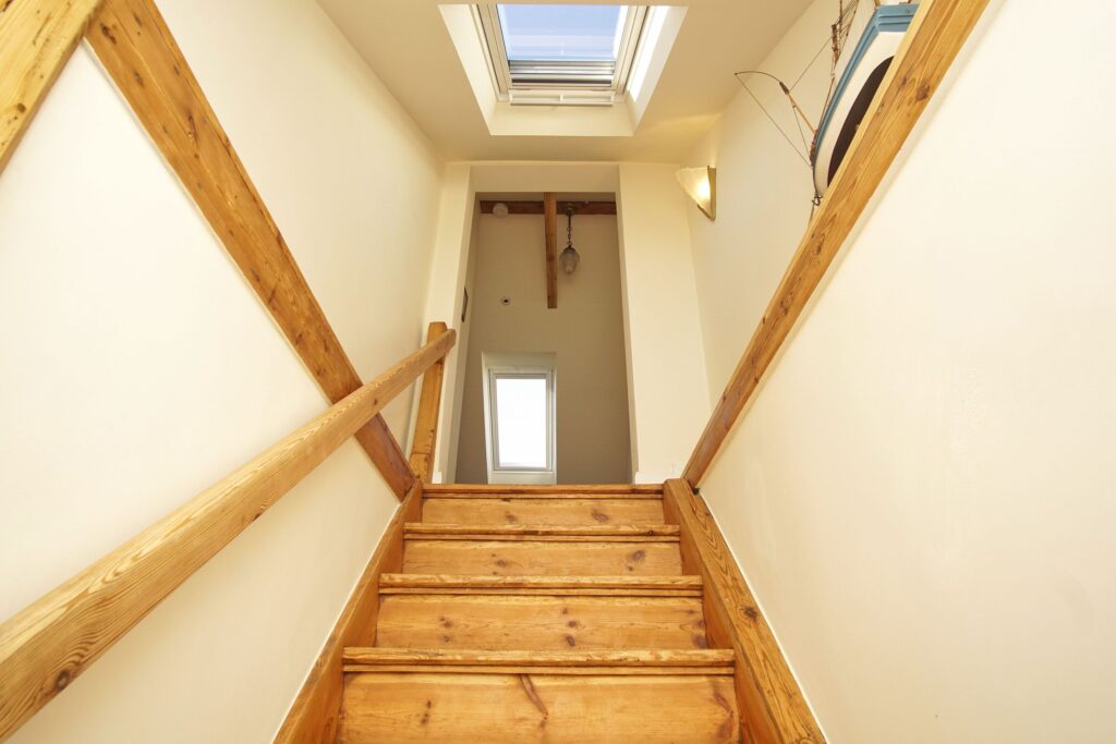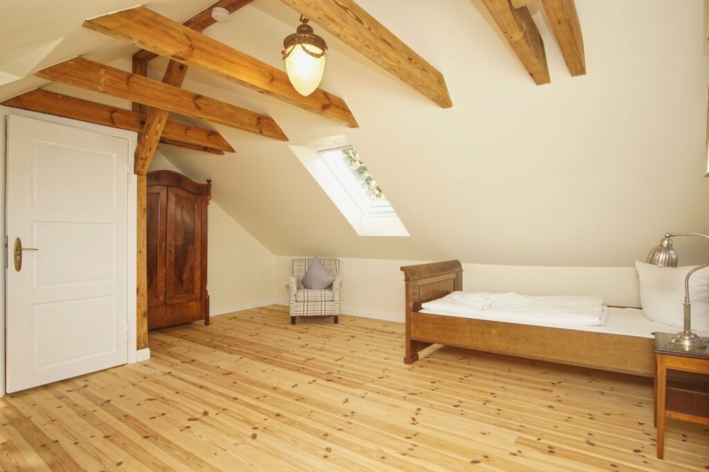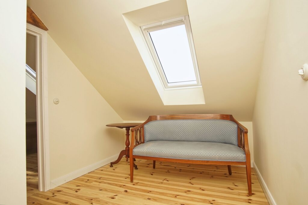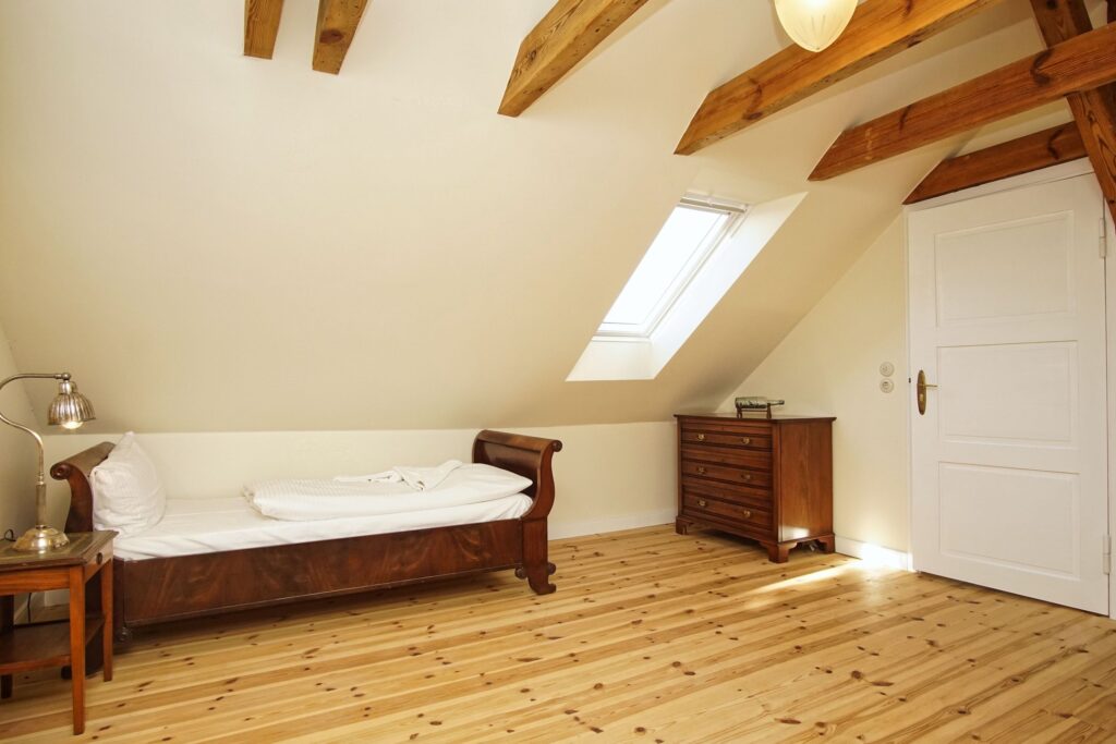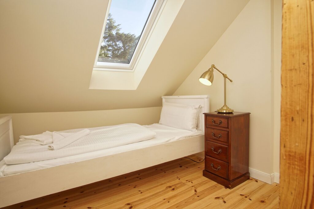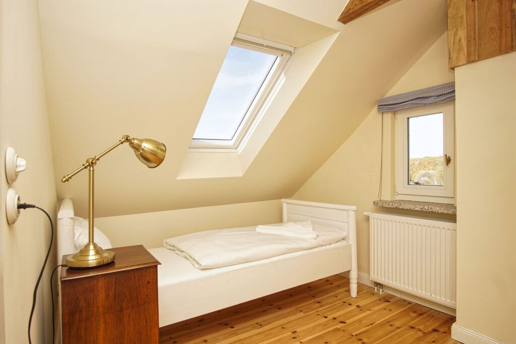 Die Wohnung bietet insgesamt drei Schlafzimmer: Ein Schlafzimmer im Obergeschoss ist mit einem komfortablen Doppelbett, einem Kleiderschrank und Meerblick ausgestattet. Im Dachgeschoss befinden sich zwei weitere Schlafzimmer, jeweils mit zwei Einzelbetten, Kleiderschrank und ebenfalls wunderbarem Blick auf die Bucht – ideal für Familien oder Freunde. Das Badezimmer im Obergeschoss ist hell und funktional eingerichtet und verfügt über Dusche, WC, Waschbecken sowie ein Fenster für angenehmes Tageslicht.