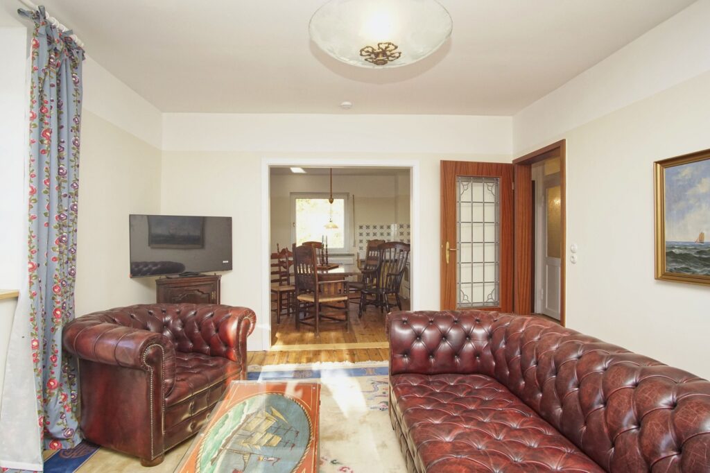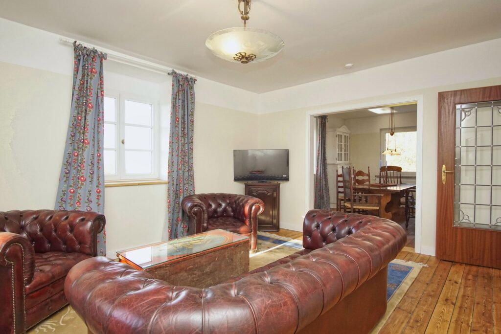Im Obergeschoss befindet sich das gemütliche Wohnzimmer mit bequemer Ledercouch, Ledersessel und Flachbild-TV – perfekt für entspannte Abende mit Blick auf das Wasser. Die offene Küche schließt sich harmonisch an und verfügt über einen Esstisch sowie eine moderne Kochnische mit Ceranfeld, Spülmaschine, Kühlschrank mit Gefrierfach, Backofen, Toaster, Wasserkocher, Kaffeemaschine sowie reichlich Geschirr, Besteck und Küchenutensilien. Auch hier begleitet Sie der herrliche Meerblick.