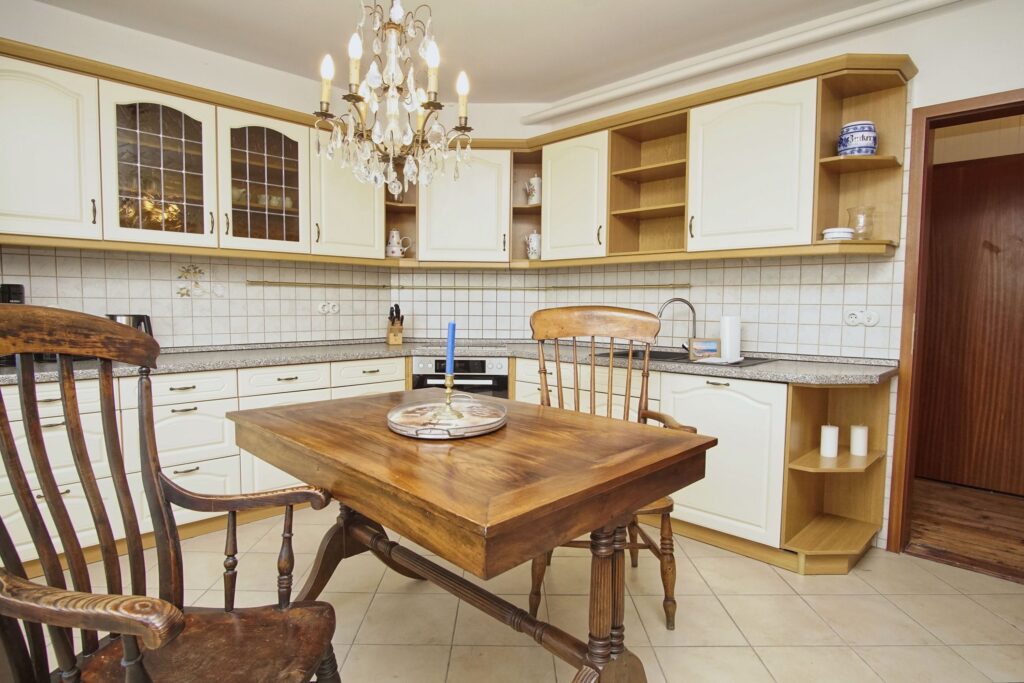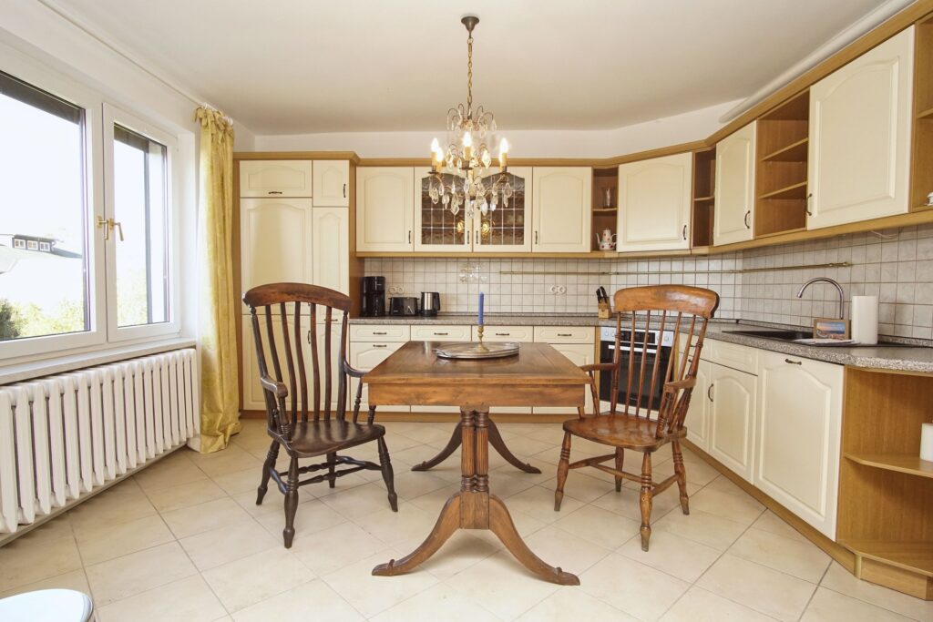 Der Wohnbereich lädt mit einer bequemen Ledercouch und einem Flachbild-TV zum Entspannen ein, während Sie zugleich den Blick auf das Wasser genießen können. Die offene Küche ist komfortabel ausgestattet und verfügt über einen Esstisch, ein modernes Ceranfeld, Spülmaschine, Kühlschrank mit Gefrierfach, Backofen, Toaster, Wasserkocher, Kaffeemaschine sowie reichlich Geschirr, Besteck und Küchenutensilien – ebenfalls mit herrlichem Meerblick.