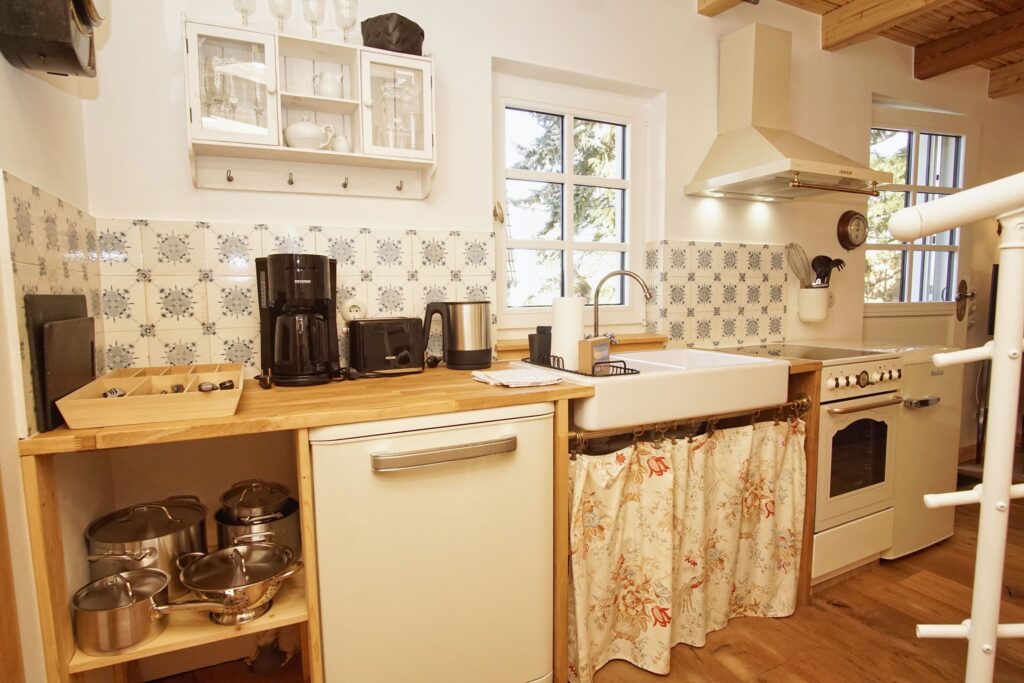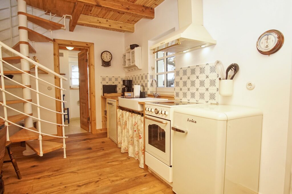 Die offene Kochnische, harmonisch in den Wohnraum integriert, ist bestens ausgestattet: Cerankochfeld, Backofen, Spülmaschine, Kühlschrank mit Gefrierfach, Toaster, Wasserkocher, Kaffeemaschine sowie reichlich Geschirr, Besteck und weitere Küchenutensilien stehen Ihnen zur Verfügung. Ein Esstisch rundet den Bereich funktional und charmant ab.